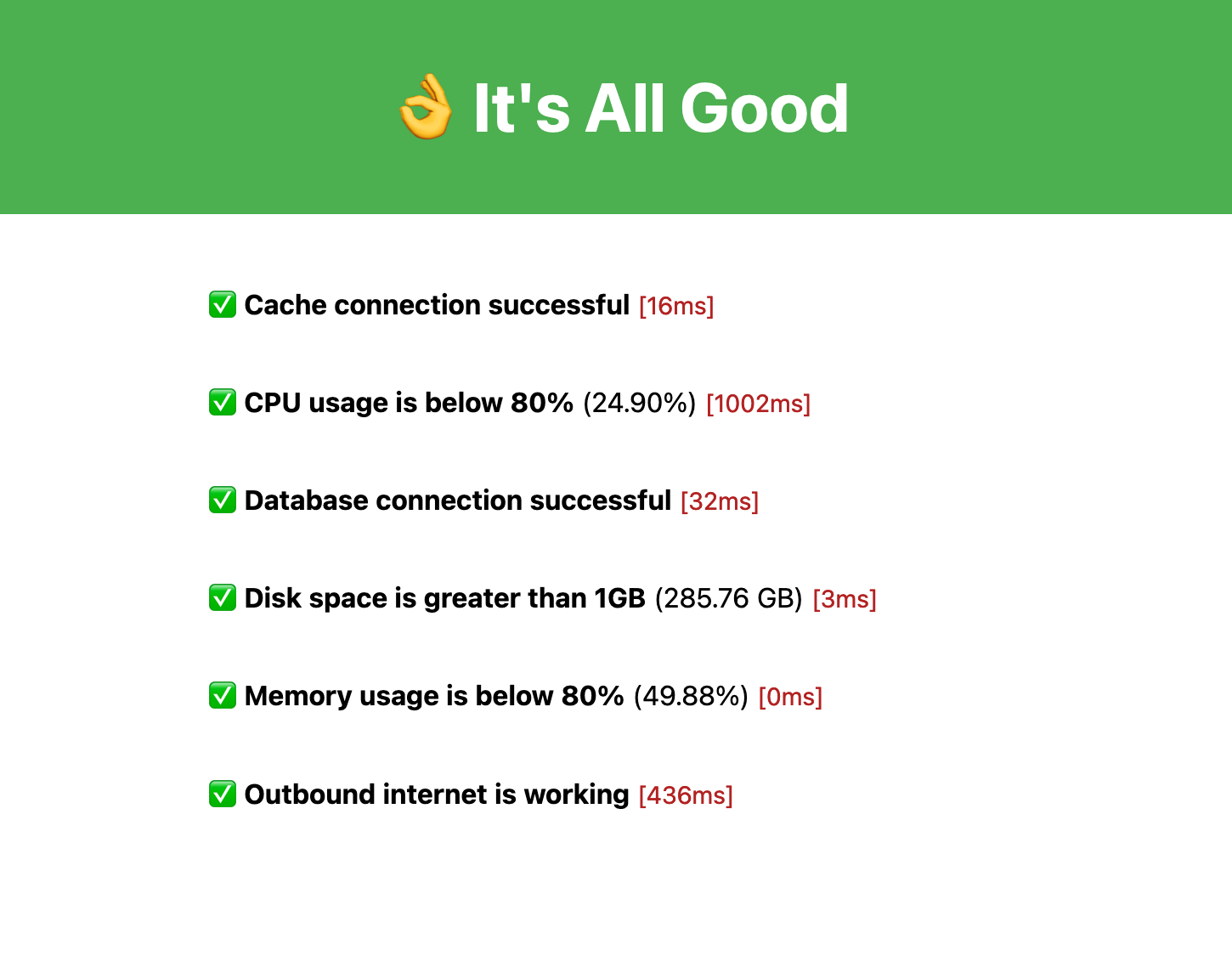 Over the weekend, I shipped a new open source project - allgood. It's an npm module designed to instantly add a /healthcheck page to your app. Out the box it supports Express, Fastify and Hono. It could be adapted to use Next as well (although I haven't tested this).