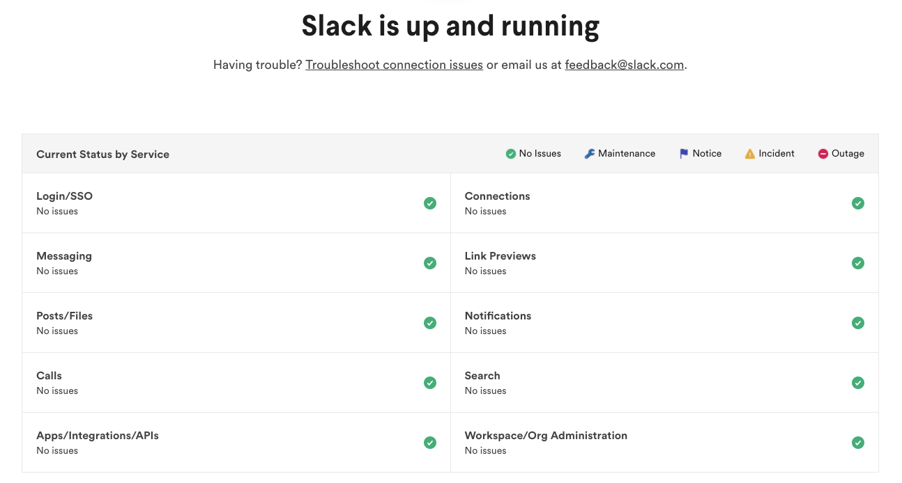 You can see that it doesn't contained detailed break downs of information, but rather individual components of a system that a customer will be familiar with - messaging, login, notifications etc. You should follow a similar pattern, if your system is an API that delivers Woody Harrelson's face as placeholder images for frontend developers, then perhaps you'd have the following services you can report on: